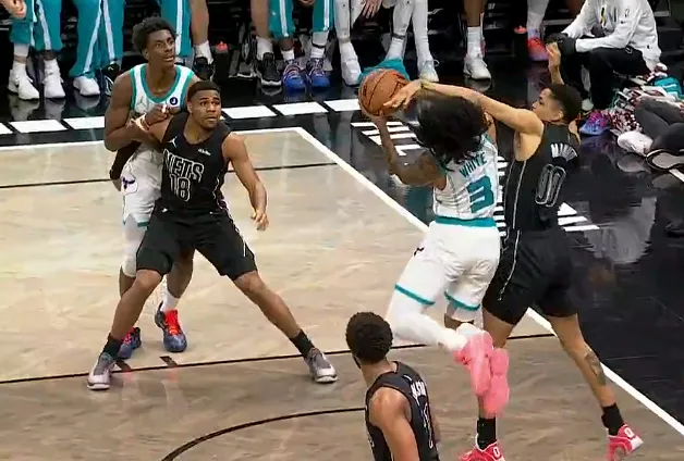 虎扑04月01日讯 NBA常规赛,黄蜂对阵篮网的比赛正在进行中。第四节比赛中,米诺特防守下压直接打到怀特面部,裁判回看吹罚一级恶意。来源:虎扑虎扑04月01日讯 NBA常规赛,黄蜂对阵篮网的比赛正在进行中。第四节比赛中,米诺特防守下压直接打到怀特面部,裁判回看吹罚一级恶意。来源:虎扑...